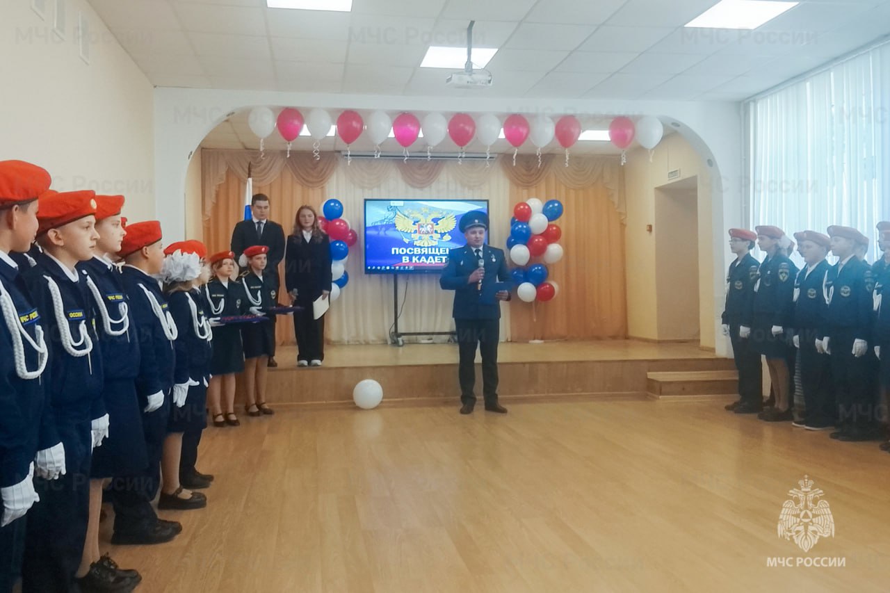 Перед Государственным флагом РФ и знаменем МЧС России ученики 6 класса средней общеобразовательной школы города Курлово и 5 класса Мезиновской средней общеобразовательной школы имени Александра Солженицына дали Клятву кадета, пообещав служить на благо Отечества и быть достойным примером для сверстников.