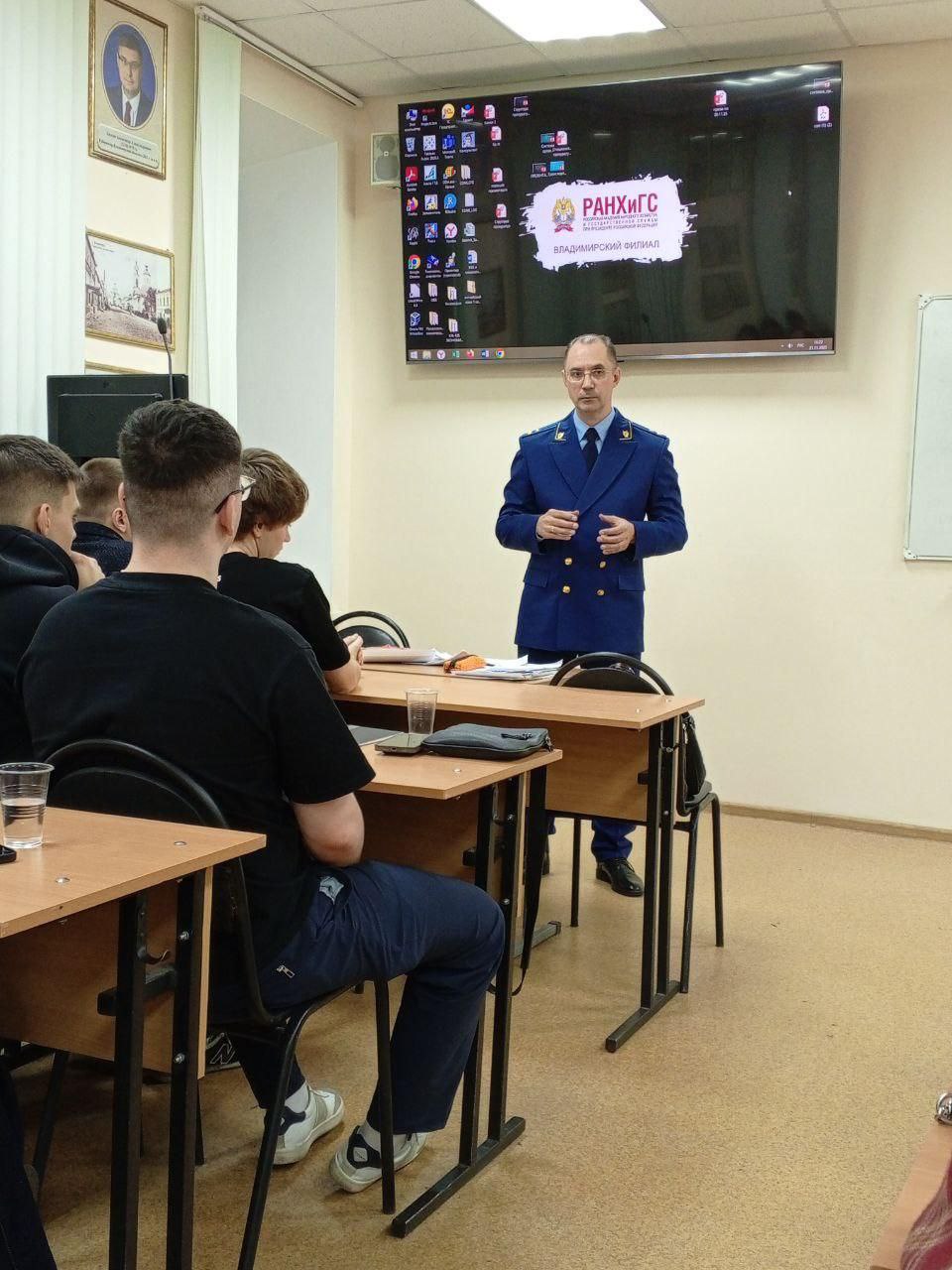 Собинский межрайонный прокурор Андрей Широких в рамках изучения дисциплины «Прокурорский надзор» провел практическое занятие со студентами 2 курса Владимирского филиала РАНХиГС.