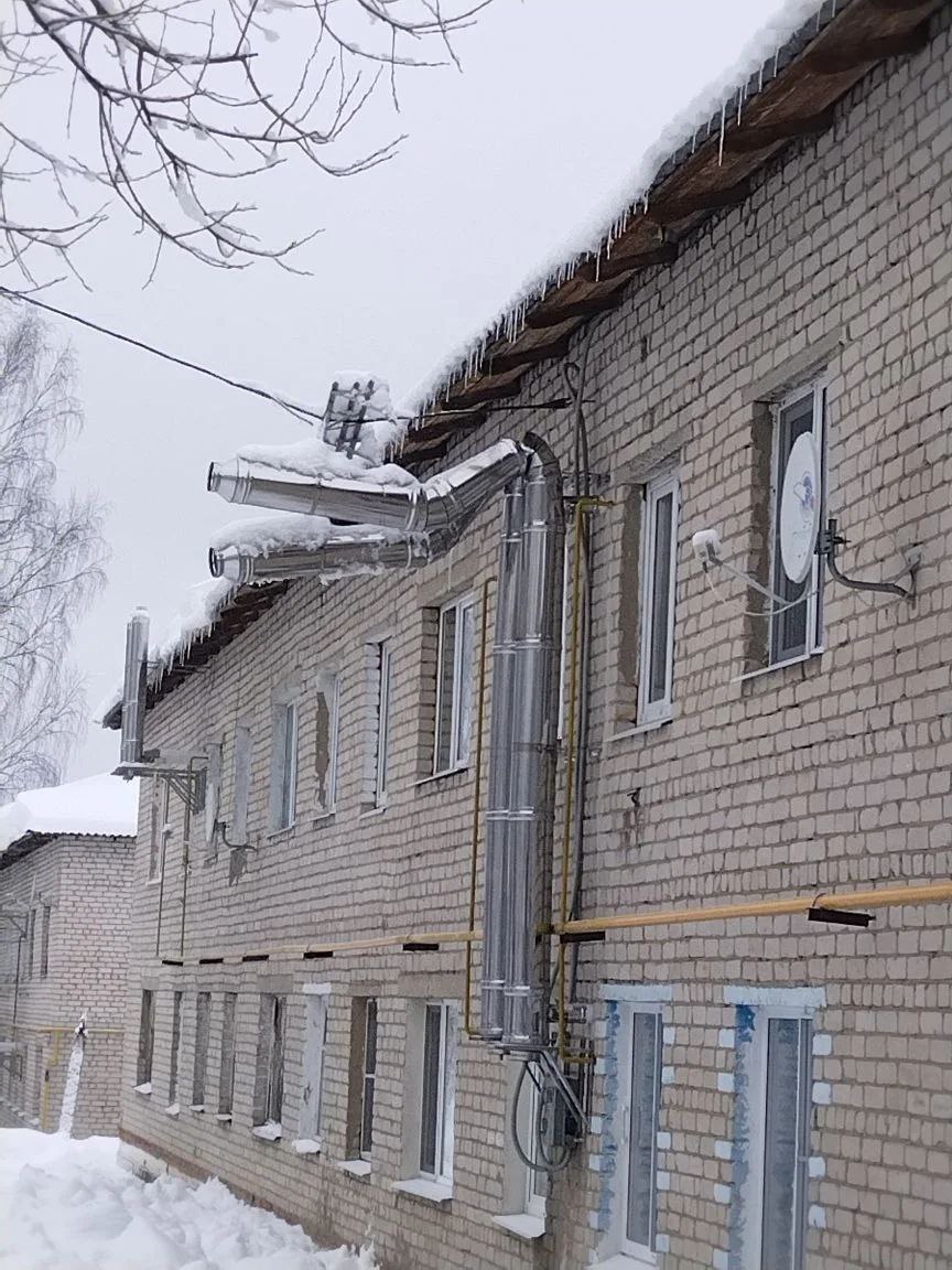 Установлено, что в результате схода ночью 15 февраля снега с кровли указанного здания произошел обрыв проводов электроснабжения, а также повреждение 2-х уличных дымоходов индивидуального газового отопления 4 квартир.