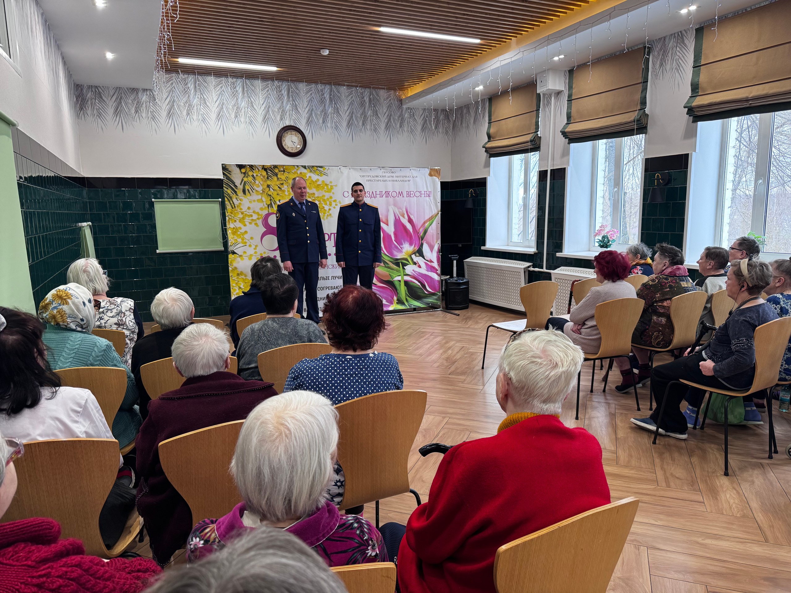 Сотрудники в торжественной обстановке поздравили женщин с наступающим Международным женским днем, пожелав им долголетия, здоровья, хорошего настроения и улыбок. Офицеры поблагодарили присутствующих дам за воспитание детей и внуков, многолетний труд на различных предприятиях Владимирской области, отметив, что женщины украшают наш мир, принося в него душевное тепло, любовь и нежность. Представители ведомства привезли для дам сладкие подарки.