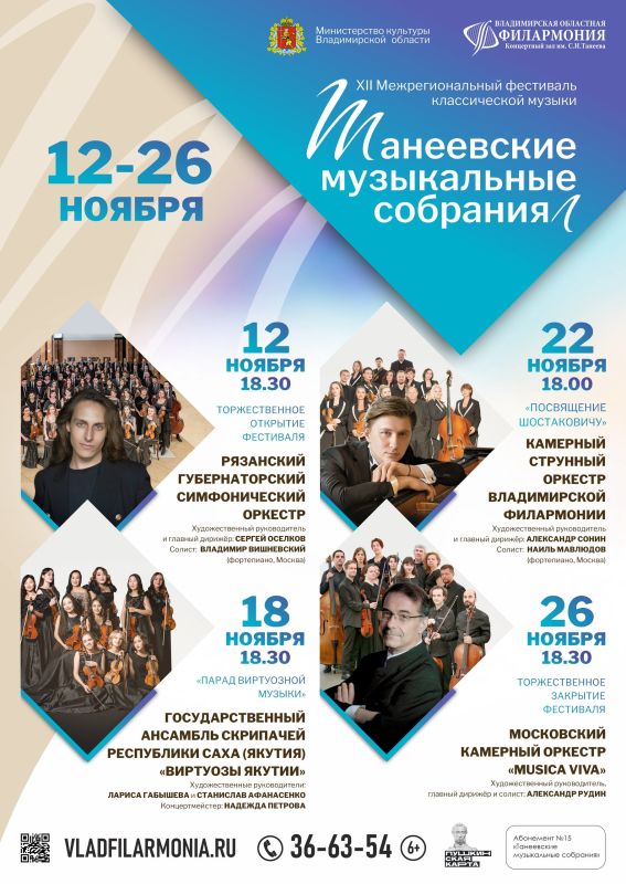 В этом году фестиваль пройдет с 12 по 26 ноября. Перед публикой выступят Рязанский губернаторский симфонический оркестр, Государственный ансамбль скрипачей Республики Саха (Якутия) «Виртуозы Якутии», Камерный струнный оркестр...