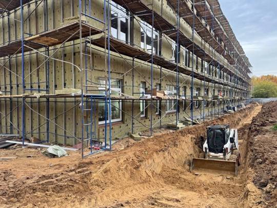 На втором этаже учебных блоков установлены оконные проёмы. В блоке «А» на 100% смонтирована крепёжная система фасадных панелей. В блоках «Б» и «В» приступили к работам по утеплению фасадов.