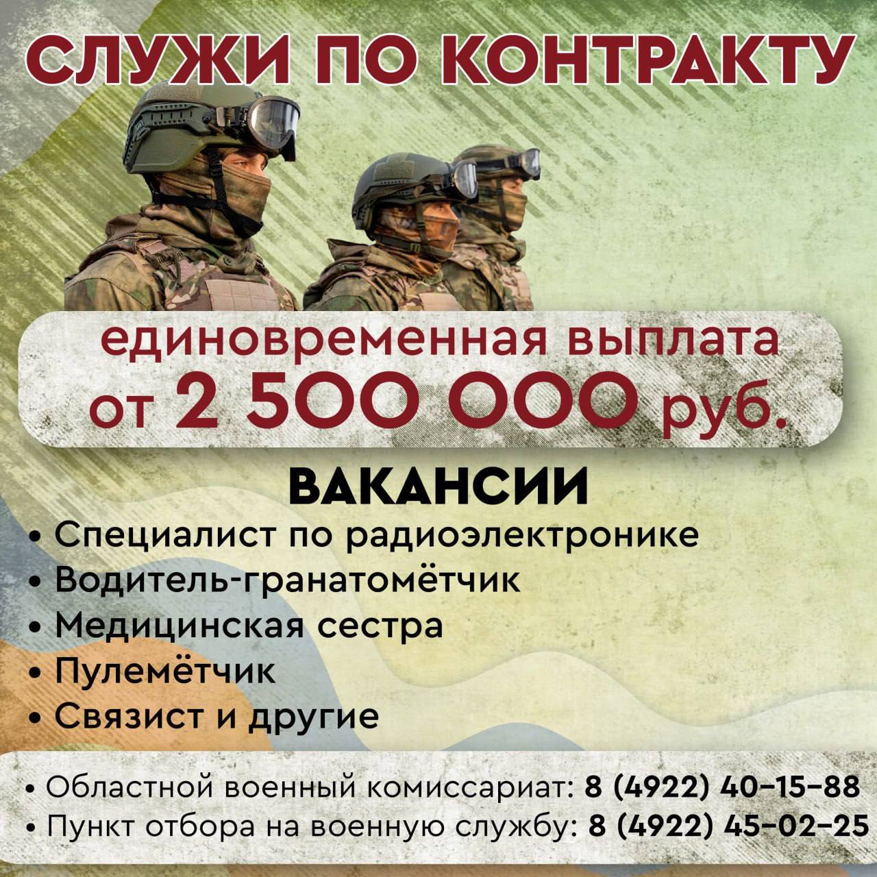 На портале «Работа России» Владимирской области открыто более 200 вакансий службы по контракту. Это возможность обеспечить себя стабильным заработком, социальным пакетом и получить гарантированную поддержку государства после службы.