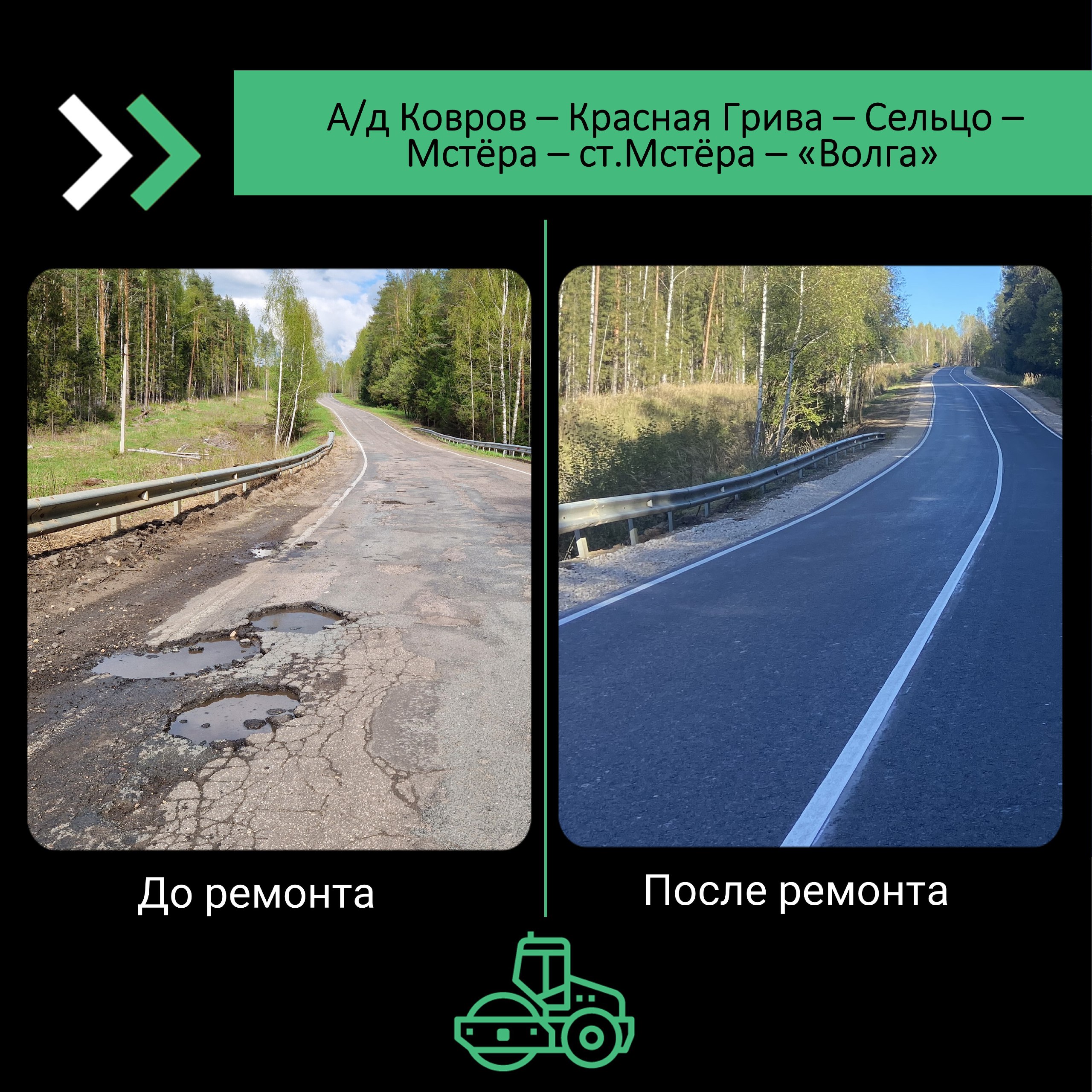 В рамках нацпроекта «Инфраструктура для жизни» в регионе отремонтировано 10 км дороги Ковров – Красная Грива – Сельцо – Мстёра – ст.Мстёра – «Волга»