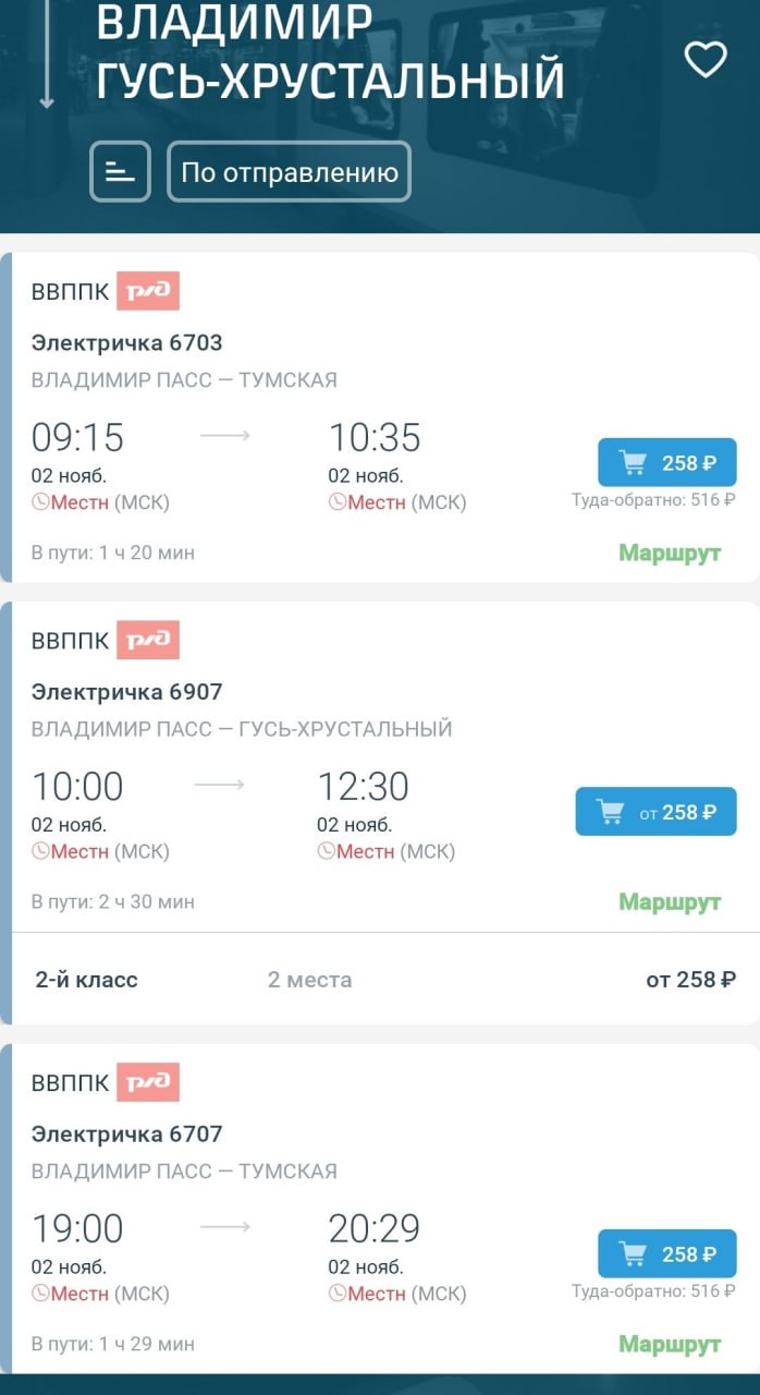Ретропоезд по маршруту «Владимир – Гусь-Хрустальный – Владимир» доступен для покупки. В приложении РЖД он значится как обычная электричка. Ехать два с половиной часа под стук колес и свист паровоза. С 1 по 4 ноября можно купить билет за 258 рублей.
