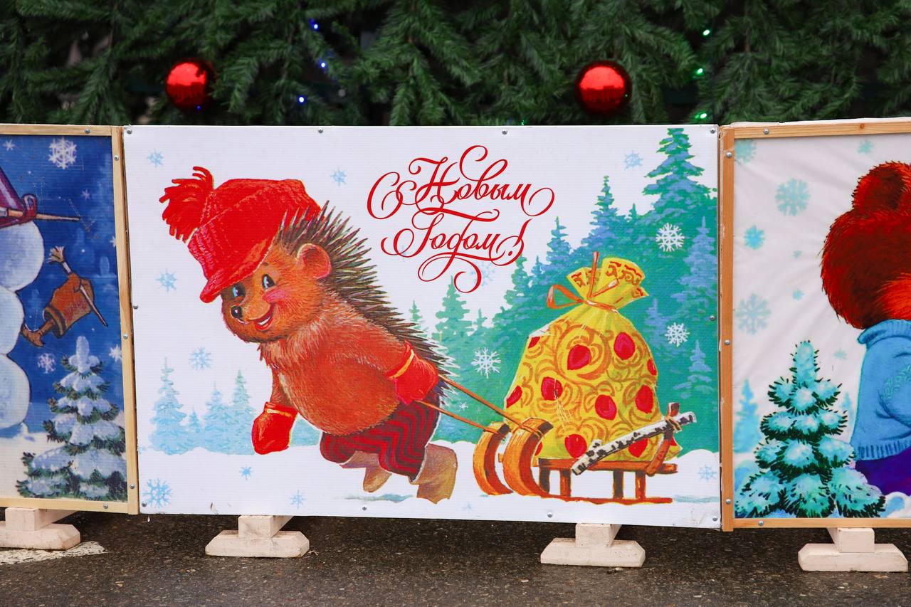 Очень лаконично смотрятся красные шары на зеленом, а внизу - галерея из любимых советских открыток. Правда, из белоснежного фона пока только само здание администрации. Ждём с нетерпением снега