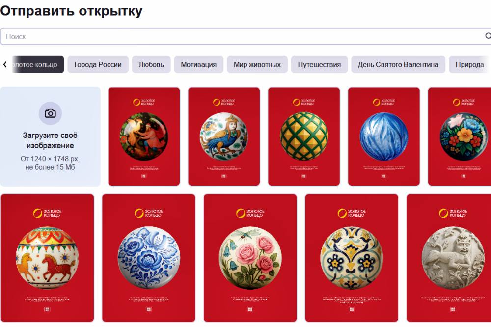 Для онлайн-отправки необходимо зайти в раздел «Золотое кольцо» с помощью сервиса RUSSPASS и по баннеру перейти на сайт Почты России в раздел «Почтовая открытка онлайн»