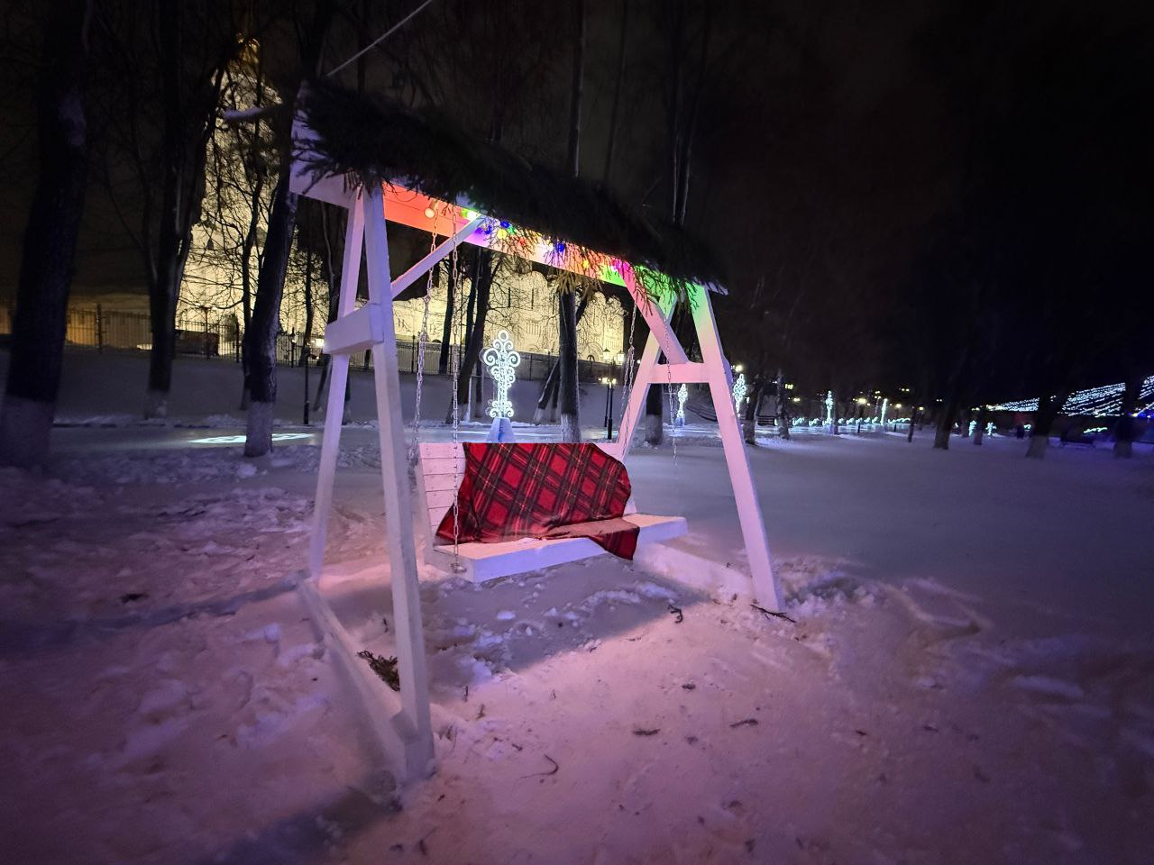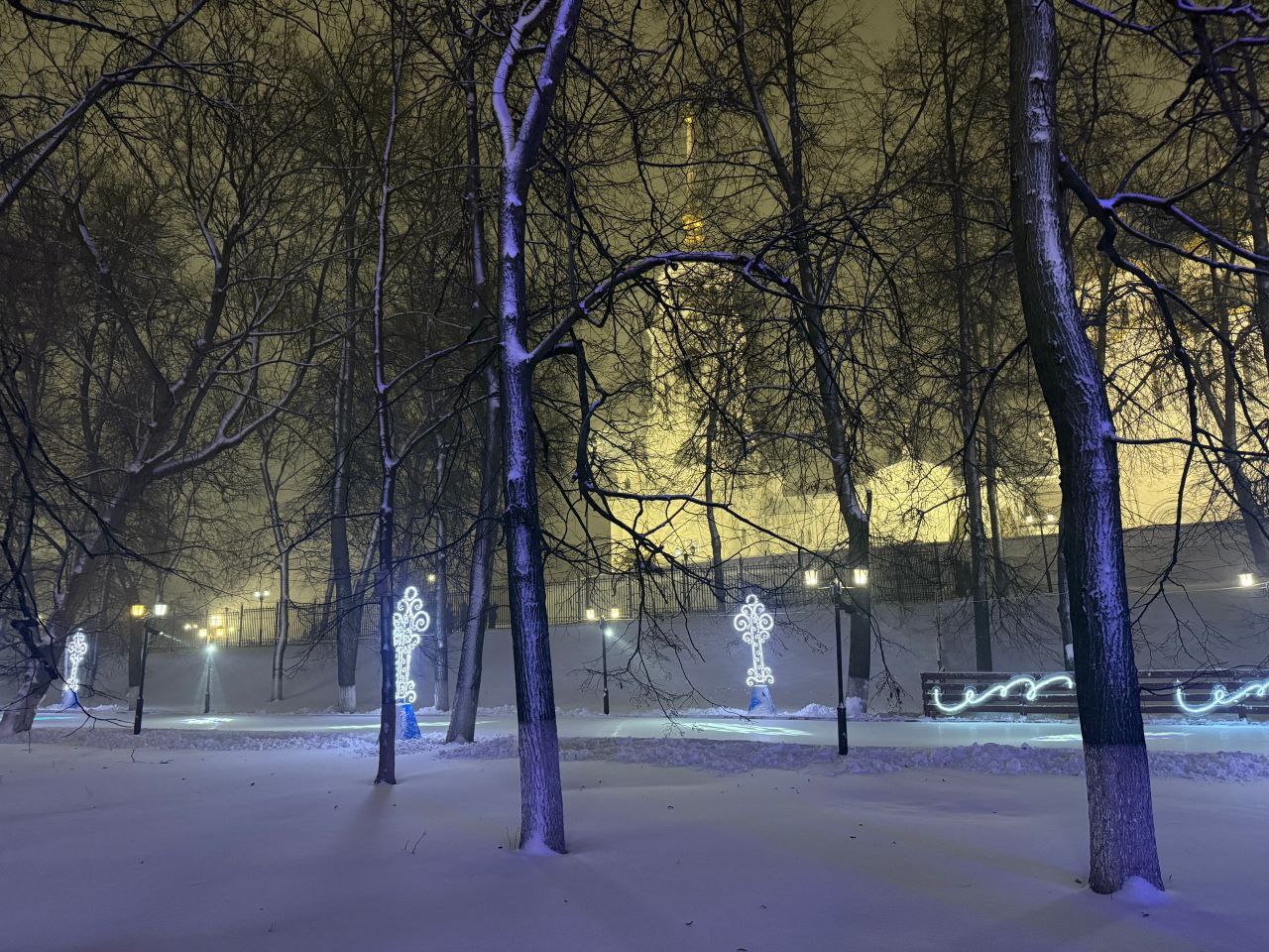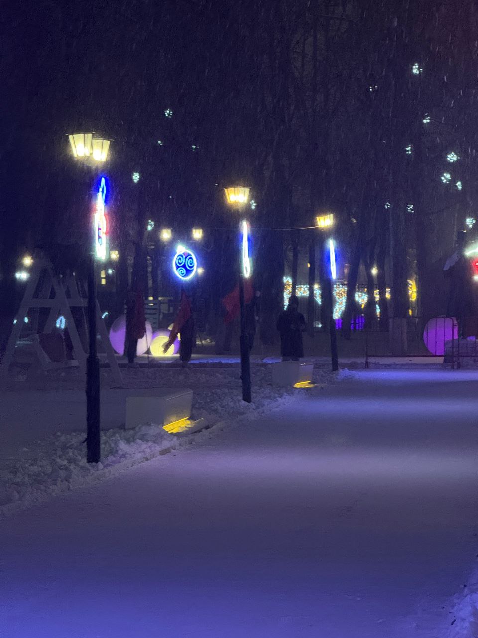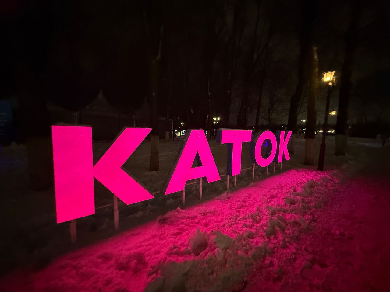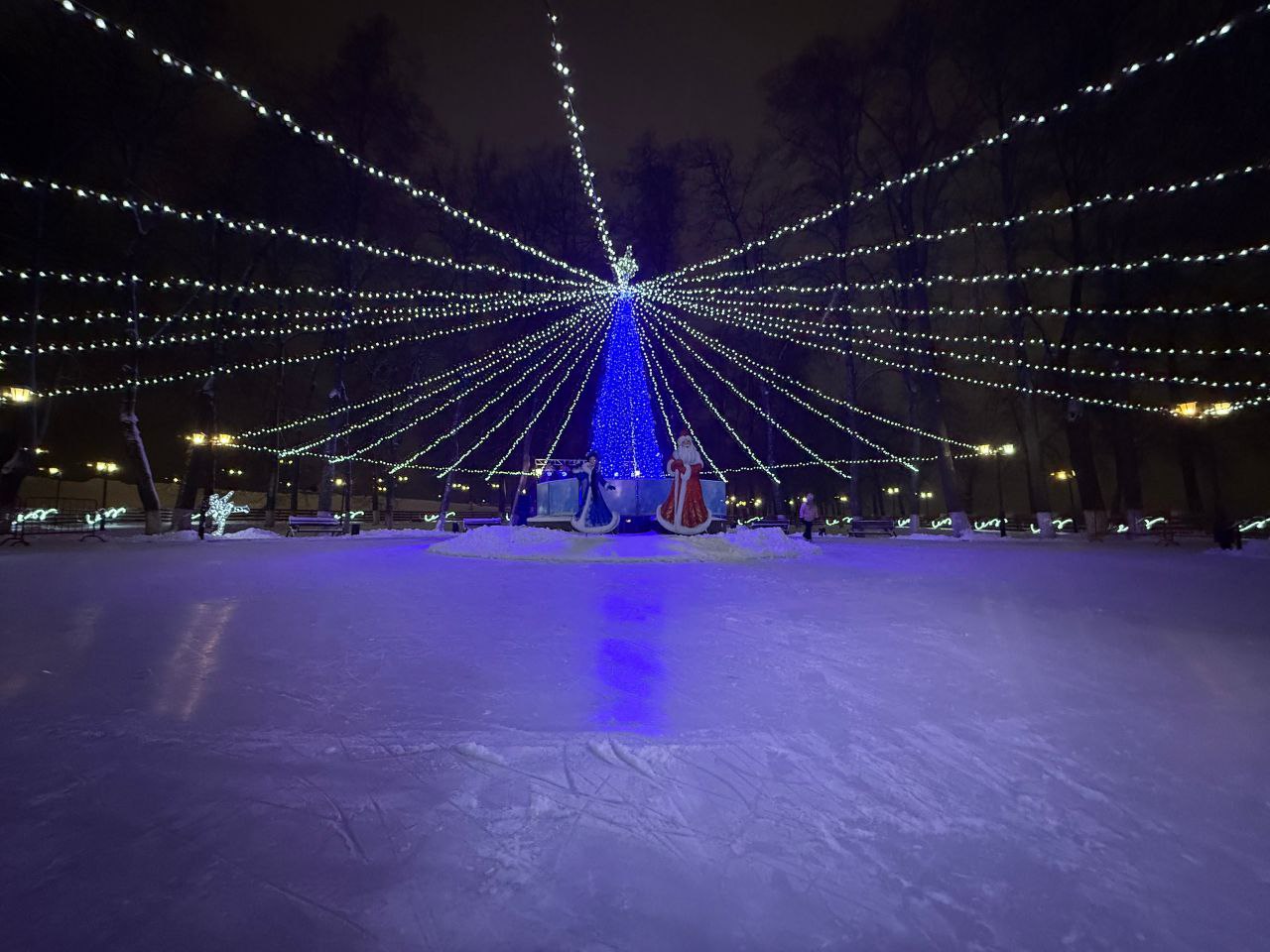 В парке Пушкина залили каток. Вход бесплатный. Вечером здесь особенно красиво - светится множество огней, много инсталляций и удивительные виды.