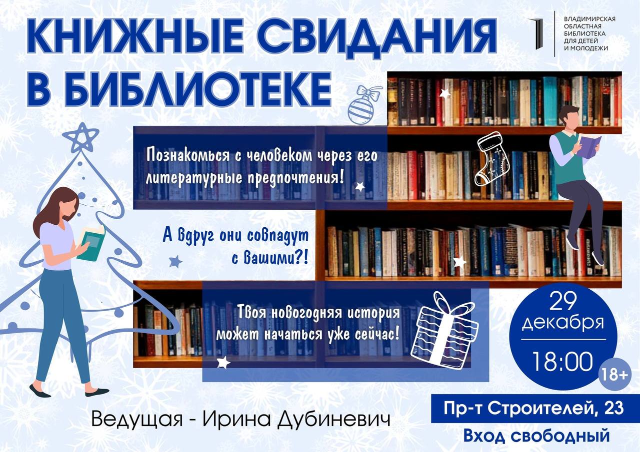 У каждого участника «Свиданий» будет возможность поделиться своими читательскими впечатлениями с разными собеседниками, которые будут меняться каждые пять минут, по сигналу. Совпавшие по книжным предпочтениям пары получат приз. Телефон для записи: 33-64-66.