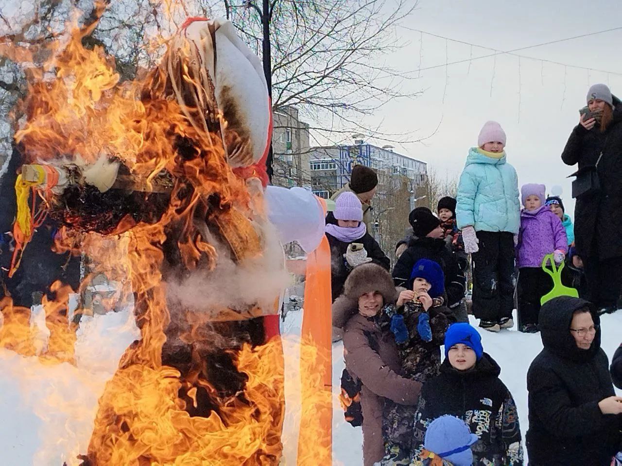 Завершился праздник традиционным сожжением чучела Масленицы, символизирующим прощание с зимой и встречу весны.