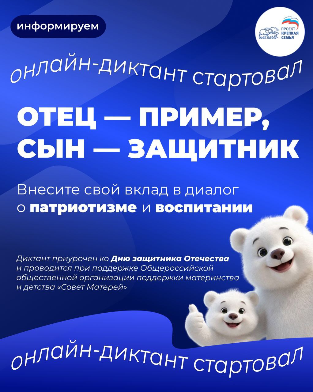 В рамках федерального партийного проекта «Крепкая семья» при поддержке Общероссийской общественной организации поддержки материнства и детства «Совет Матерей» стартовал онлайн-диктант, приуроченный к 23 февраля — Дню защитника Отечества.