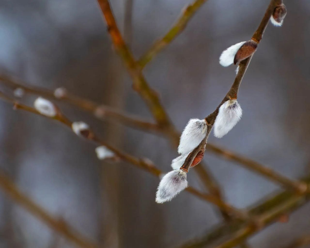 На веточках уже заметны пушистые серые почки. Однако это еще не цветение, а лишь подготовка к нему. Оно начинается, когда из-под пушистого покрытия появляются желтые тычинки. Этот процесс обычно приходится на апрель. Тогда ветки становятся ярко-золотистыми, привлекая первых насекомых-опылителей.