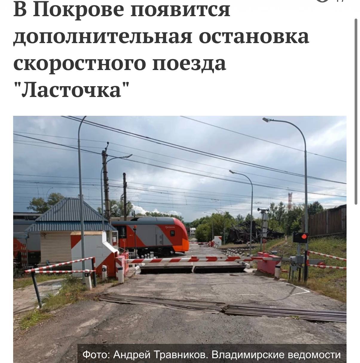 Жители Покрова в ходе посещения Владимирской области председателем ЛДПР Леонидом Слуцким обратились с просьбой рассмотреть возможность остановки на их станции скоростных поездов «Ласточка», следующих по маршруту «Нижний Новгород – Москва». Президент РЖД дал согласие.