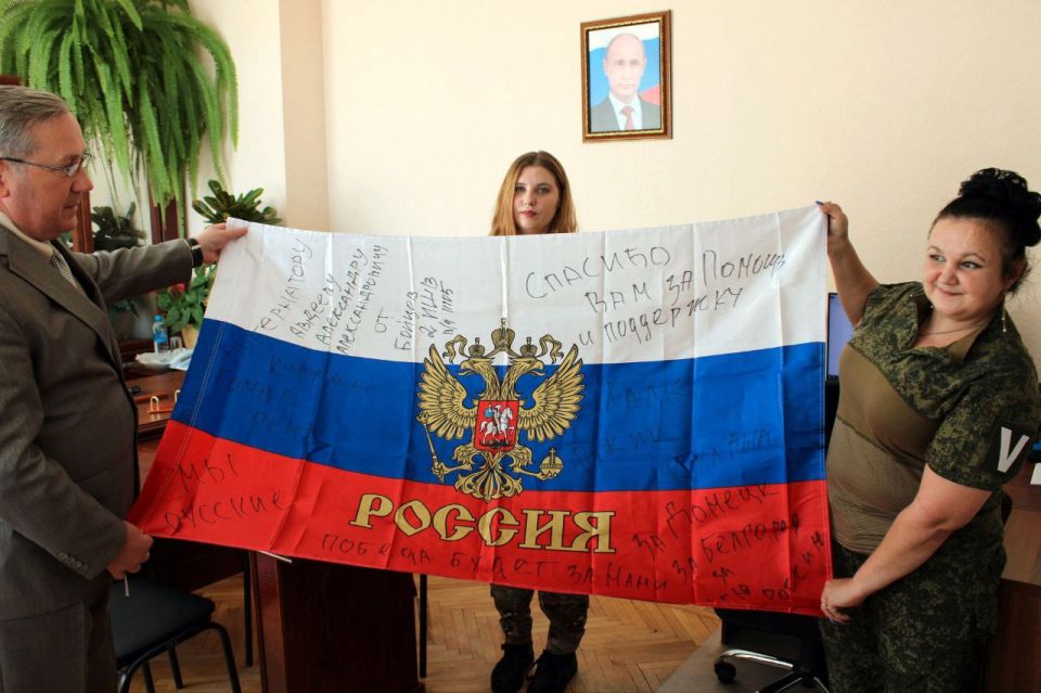 Ковровские волонтеры движения «Лучик Добра» передали губернатору Александру Авдееву уникальный флаг - с личными подписями и позывными бойцов из ДНР на полотнище.Военные передали этот флаг в знак искренней признательности Владимирской области...