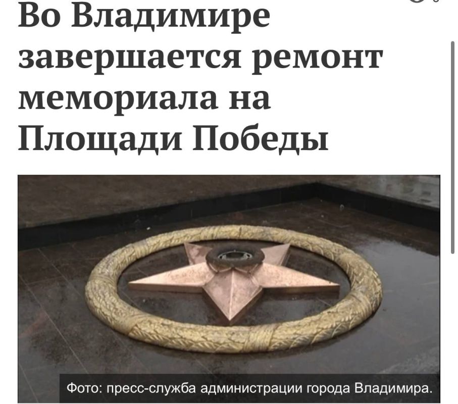 Завершается ремонт мемориала, посвященного памяти владимирцев, павших в Великой Отечественной войне. Закончили укладку новой плитки, смонтировали звезду и венок у Вечного огня. Произведен пробный пуск газовой горелки.По информации и.о....