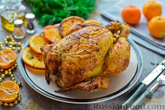 - Курица с мандаринами: Птица, запеченная с мандариновым маринадом и ароматными травами, подарит незабываемый вкус праздничного стола.