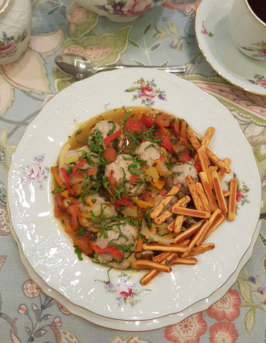 Придайте блюду финальный штрих: сформируйте маленькие фрикадельки и аккуратно опустите их в овощную смесь с 1 литром кипятка и оставшимся чесноком. Доведите до кипения, добавьте зелень и тушите фрикадельки в течение 15 минут.