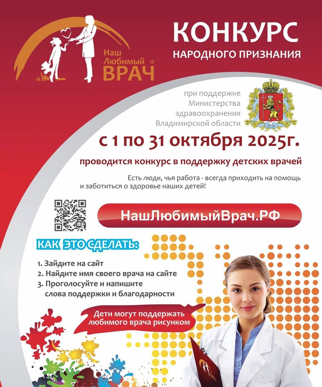 До конца октября жители Владимирской области могут выразить огромную благодарность и поддержать любимых детских врачей. Сделать это очень просто на портале по ссылке. Вы можете: написать Признание оставить Отзыв, рассказать Историю или нарисовать Рисунок.