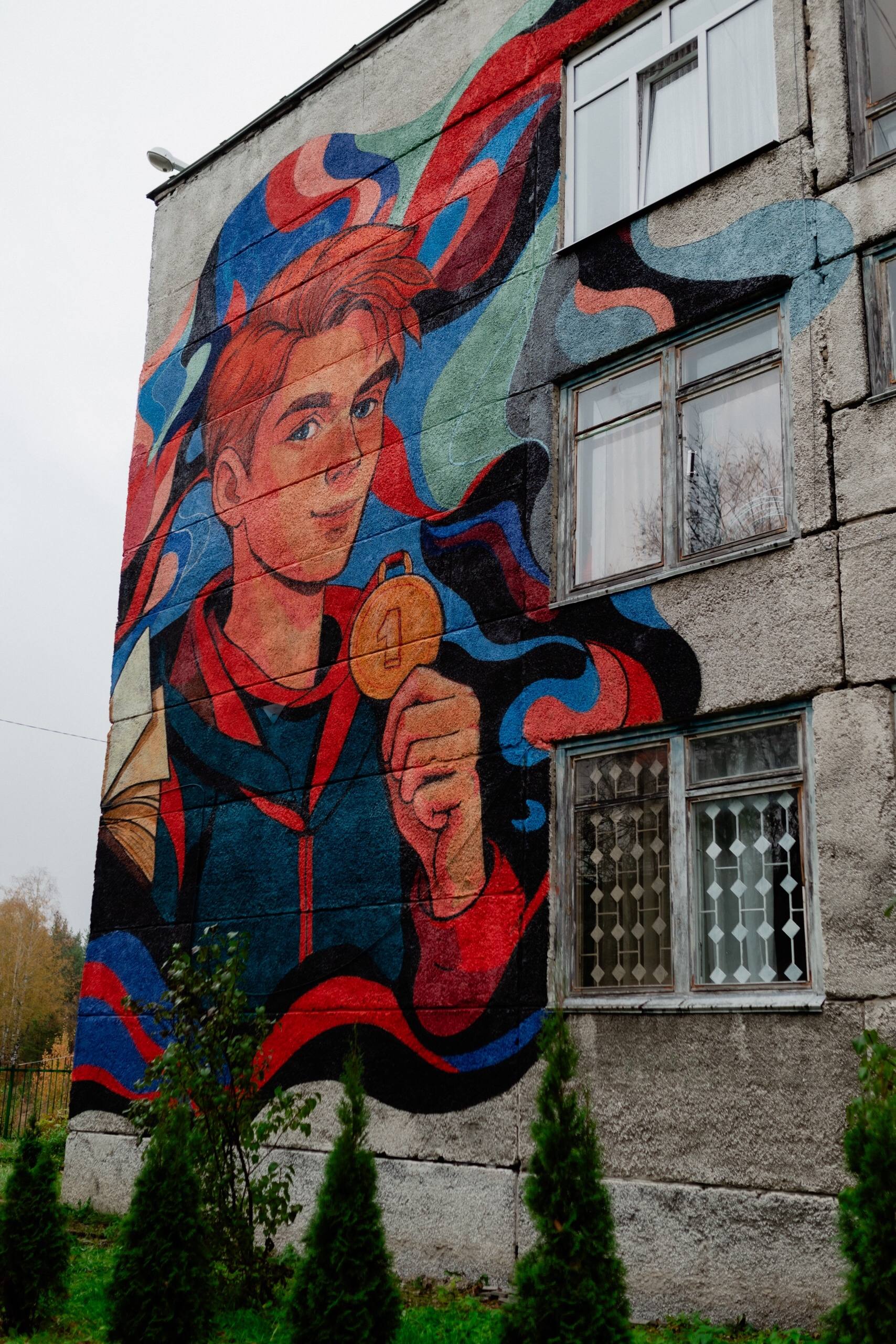 На первом мурале изображена девушка, заботливо держащая в руках цифру «1», что символизирует теплоту внутренних отношений, заботу и бережное отношение к каждому ребенку. А на новом рисунке - юноша с медалью в руке. Это символ стремления к достижению своих целей.