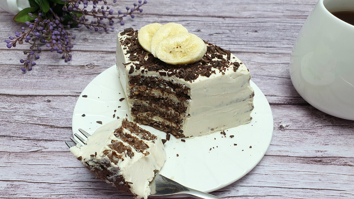 Теперь пришла очередь крема: нужно смешать мягкий творог с арахисовой пастой и добавлением подсластителя. На следующем этапе следует собрать торт, промазывая коржи полученным кремом, а также покрывая верх и боковые стороны торта. Для стабилизации структуры рекомендуется убрать торт в холодильник на ночь. По желанию, перед подачей его можно украсить.