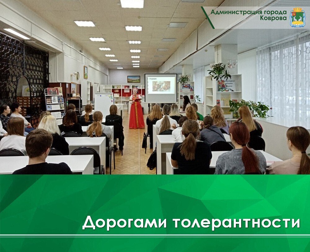 В целях воспитания, уважения к истории и культуре других народов 13 ноября в Центральной городской библиотеке имени С. К. Никитина МБУК «ЦБС г. Коврова»прошел урок толерантного общения «Дорогами толерантности», посвященный Международному дню толерантности.