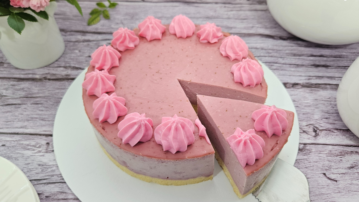 Форма ставится в противень с горячей водой и помещается в заранее разогретую до 155°C духовку. Выпекать десерт следует около 55 минут, и готовность можно определить по легкому покачиванию середины. После выпекания чизкейк оставляют остывать в духовке с приоткрытой дверцей, а затем помещают в холодильник минимум на пару часов. При желании, десерт можно украсить легким кремом из рикотты и ксантановой камеди.
