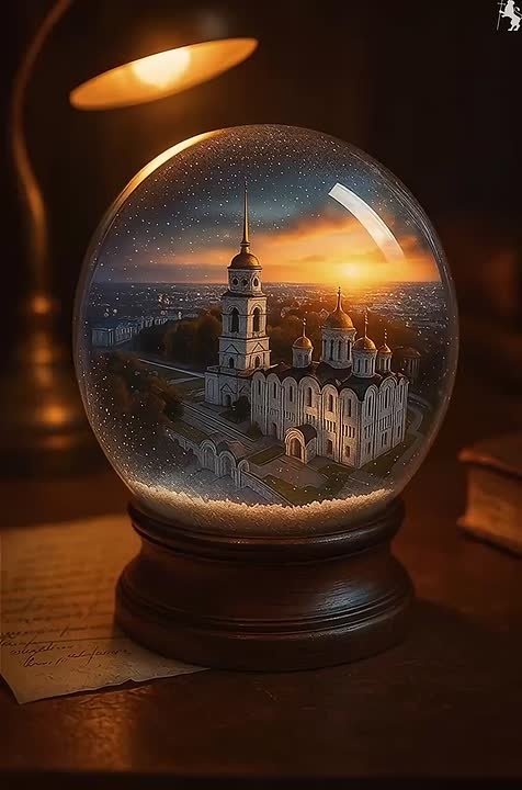 Внутри хрустального шара, под мягким светом, белые снежинки легко и воздушно парят, а за ними – величественный Успенский собор, окутанный закатным сиянием... Это же настоящий кусочек сказки!