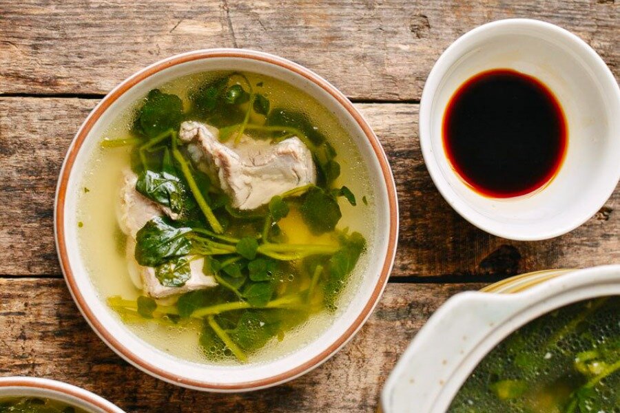 Нарезанные на кусочки свиные ребрышки помещаются в кастрюлю, заливаются водой и ставятся на огонь. После закипания воду необходимо слить и промыть ребрышки под проточной водой.Верните ребрышки в кастрюлю с добавленным имбирем и 1500 мл свежей воды. Доведите до кипения, потом уменьшите огонь и варите под крышкой около 90 минут. Это позволит мясу стать мягким и насыщенным вкусом.После 90 минут добавьте сол и тщательно перемешайте, готовьте еще 30 минут. Удалите плавающие частицы из бульона с помощью сита. Также дайте бульону охладиться, если на поверхности образовался жир.Теперь пора добавить свежий кресс-салат. Накройте кастрюлю крышкой и томите на медленном огне 10-20 минут. Будьте внимательны: чем дольше кресс-салат варится, тем более насыщенным становится вкус бульона, но его яркий зеленый цвет начнет тускнеть.В завершение попробуйте на вкус и приправьте черным перцем.Подавайте этот божественный суп с порцией риса и соевым соусом, чтобы насладиться неповторимым сочетанием ароматов и вкусов. Он подойдет как для семейного обеда, так и для дружеской вечеринки.