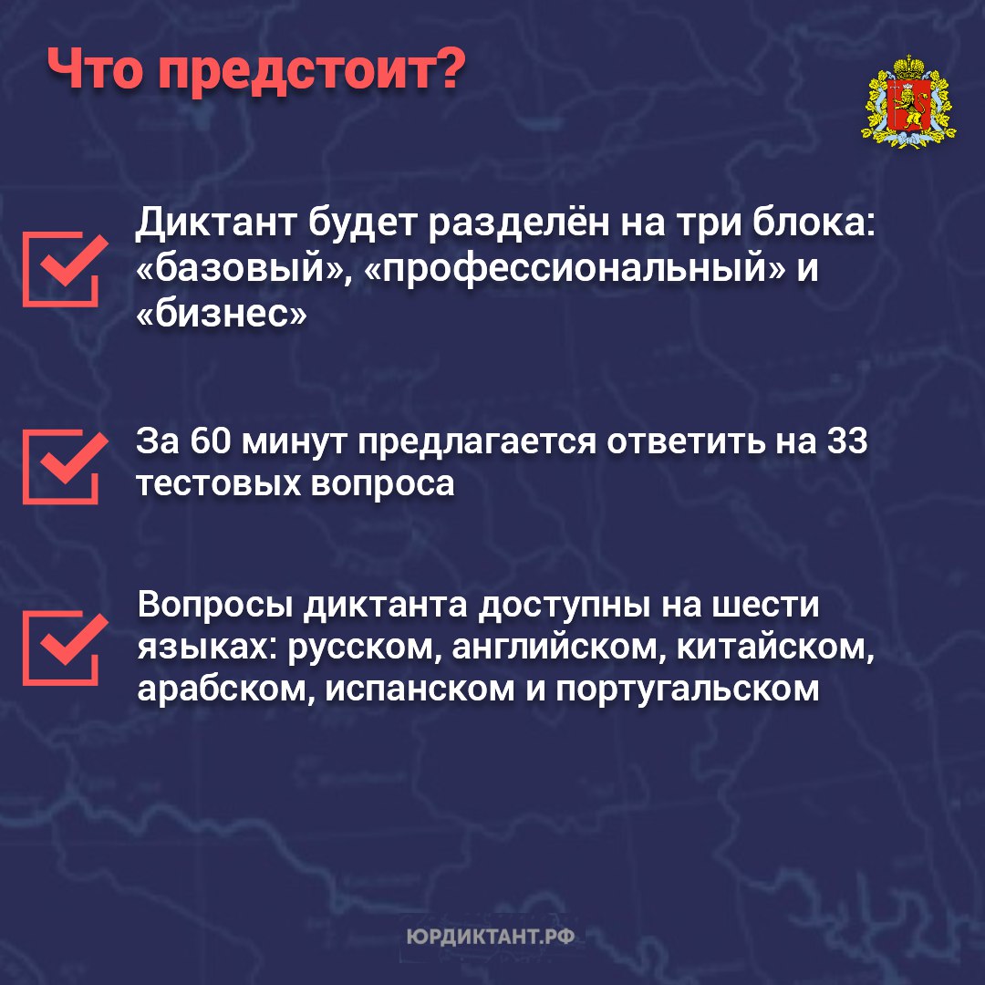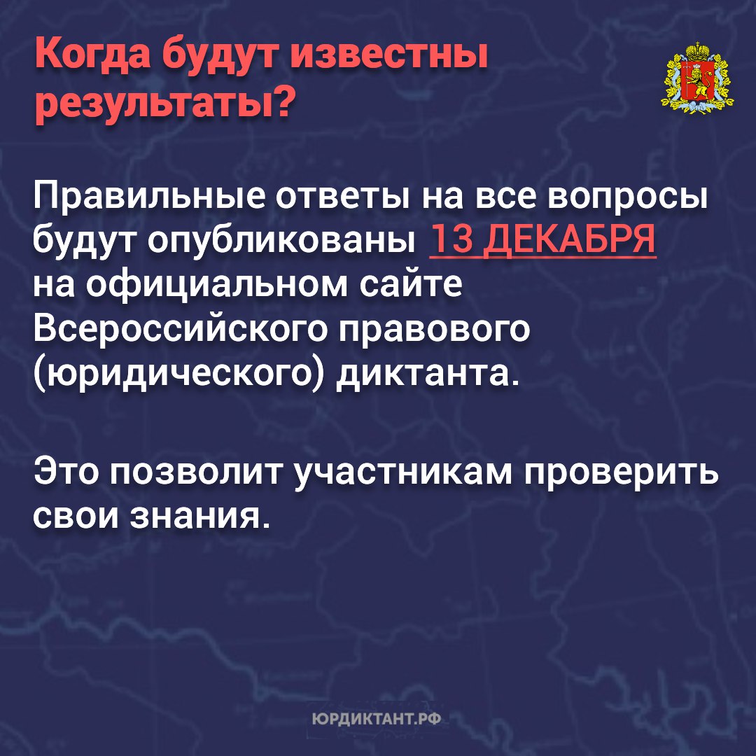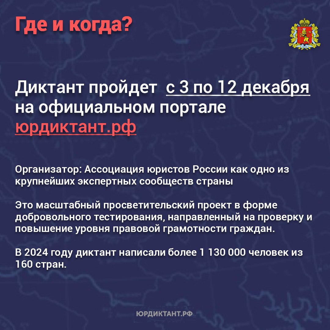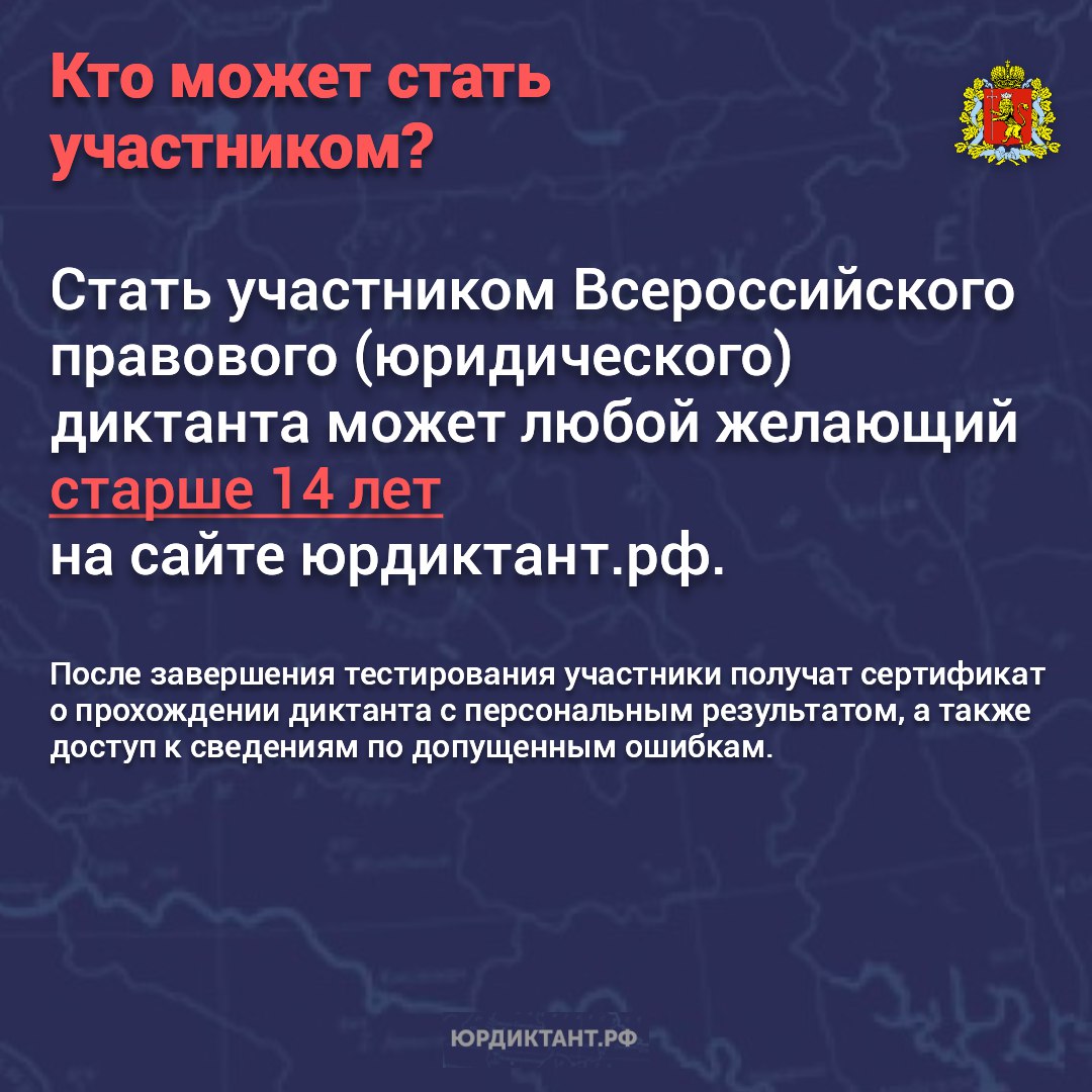 Проверить свои правовые знания и восполнить пробелы позволяет всероссийская акция. Диктант проходит до 12 декабря на сайте юрдиктант.рф. Чтобы стать участником, достаточно пройти опрос онлайн.
