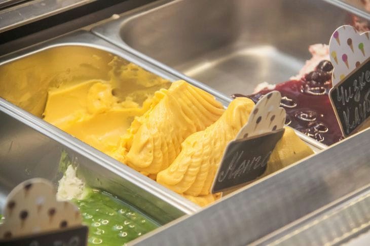 Когда эта смесь охлаждается и замерзает, она приобретает насыщенную кремовую текстуру. Мороженое может быть также и фруктовым, такое называют "сорбет".