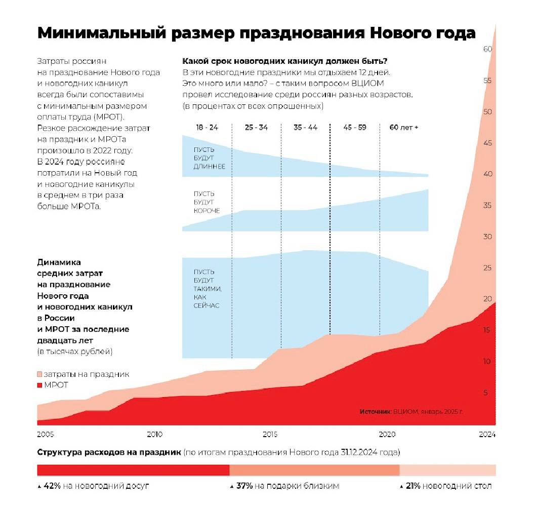 Мы подсчитали, что раньше затраты на новогодние праздники были сопоставимы с МРОТ. А вот с 2022 года ситуация изменилась. В прошлом году россияне в новогодние праздники потратили в 3 раза больше МРОТ.