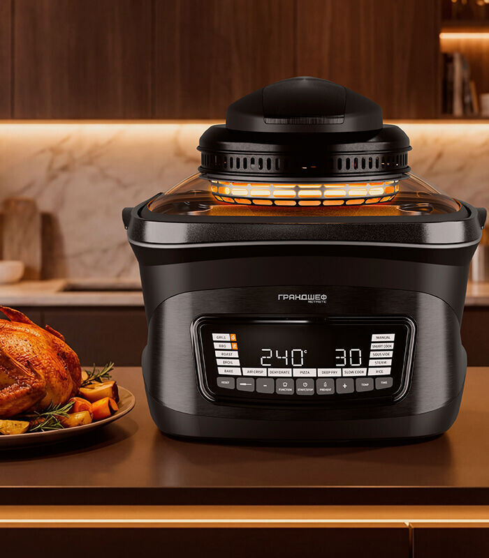 Первой на очереди стоит новинка этого года — Грандшеф, который совмещает в себе функции аэрогриля, пароварки, мультиварки и множества других устройств. С таким помощником можно значительно сэкономить место на кухне и ускорить процесс приготовления блюд. Специальный термощуп покажет, когда мясо или рыба готовы, а большие объемы (до 8 литров) подойдут для страв на большую семью.