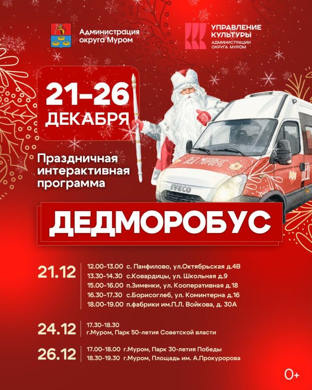 А еще по Мурому колесит Дедморобус, раздавая порции праздничного настроения. Завтра он - в парке 50-летия Советской власти, а 26-го – в парке 30 лет Победы и на площади им. А. Прокуророва (Вербовский).