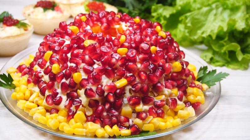 Этот салат является великолепным сочетанием разных текстур и вкусов: отварной картофель, морковь, нежное мясо, консервированная кукуруза и гранат делают его не только красивым, но и невероятно вкусным. Каждый слой приносит свою ноту в общий аккорд.