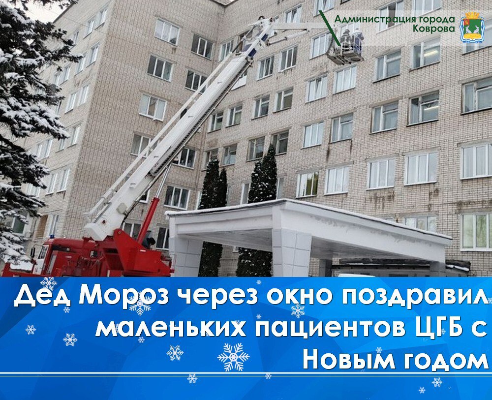 Сегодня, 29 декабря, в канун Нового года, в детское соматическое отделение, детское инфекционное отделение и отделение детской хирургии Центральной городской больницы Коврова через окно прибыл Дед Мороз. Праздник организовали управление культуры и молодежной политики администрации города совместно с представителями 4 ПСО МЧС г.Коврова.