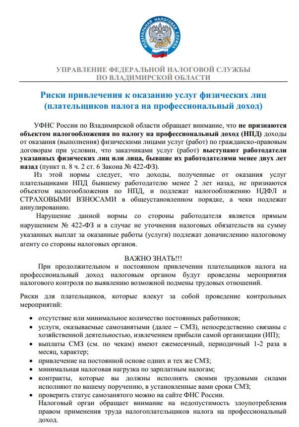 Министерство финансов и федеральная налоговая служба информируют граждан о рисках, связанных с неформальной занятостью, о рисках привлечения к оказанию услуг физических лиц (плательщиков налога на профессиональный доход)