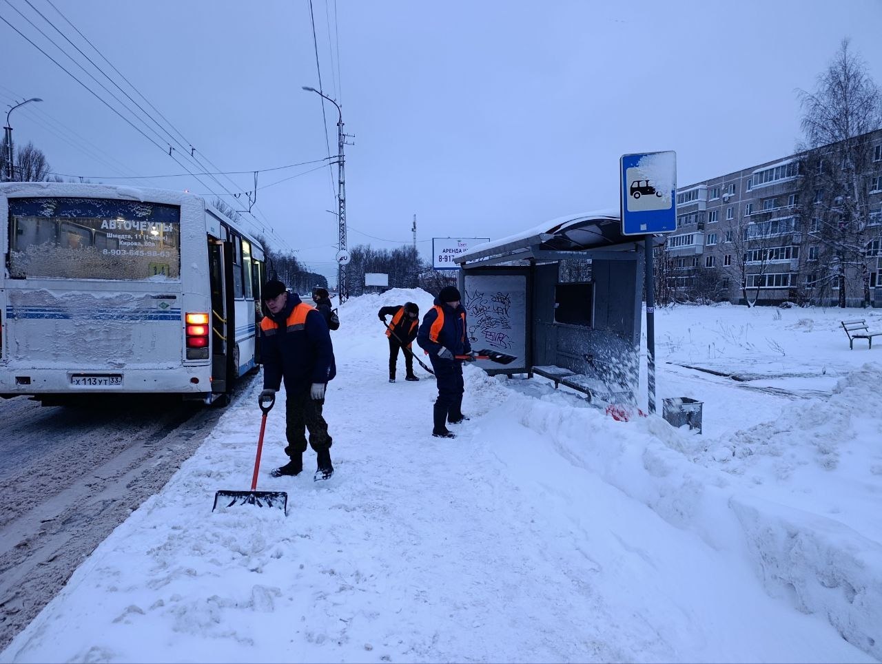 Уборка и противогололедная обработка тротуаров и остановок, вывоз снега 14 января