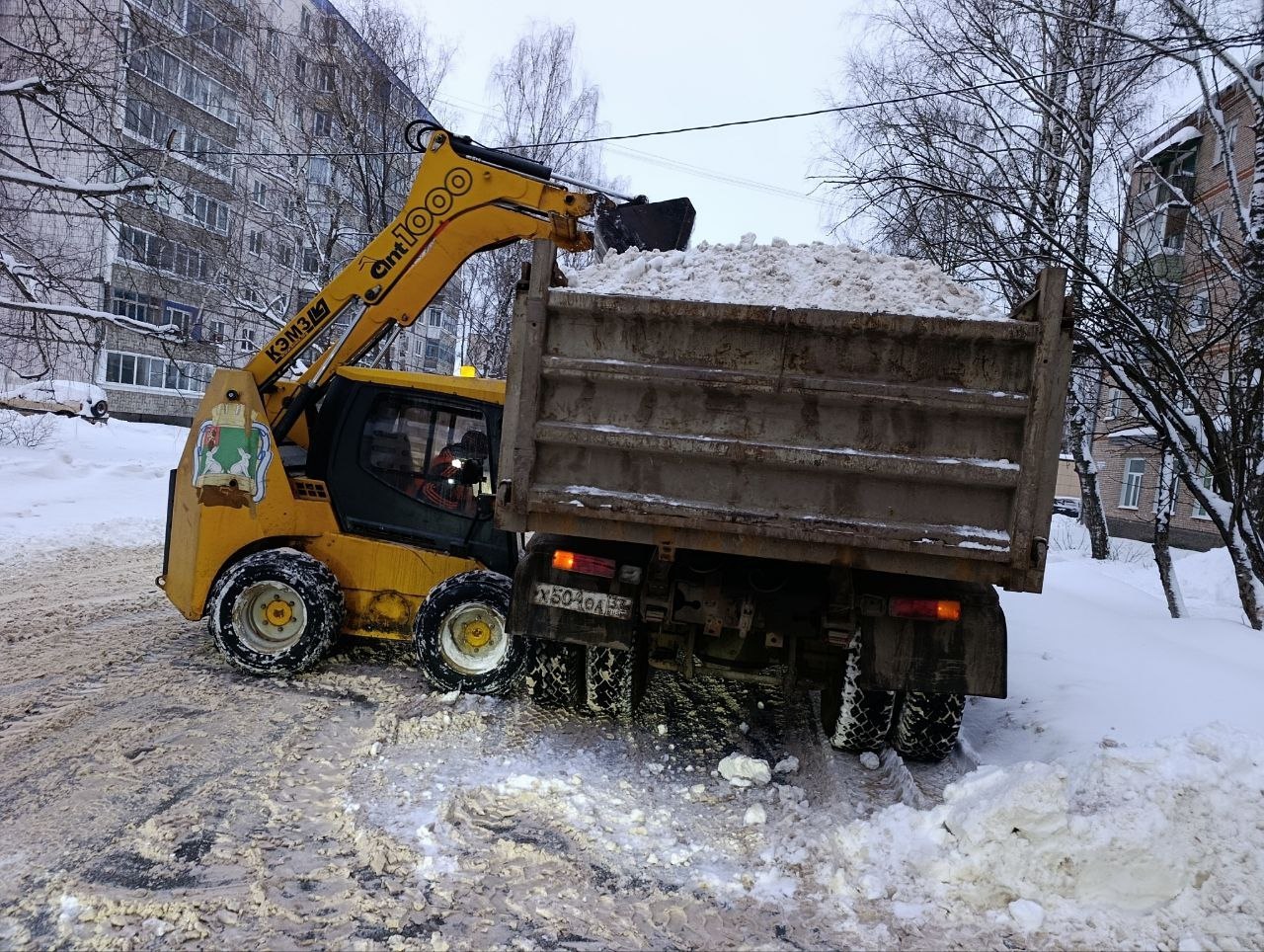 МАЗ, погрузчик АНТ-1000 вывозят снег с пр. Ленина на участке от ул. Лепсе до ул. Октябрьской. С начала снегопада вывезено уже более 6500 кбм. снега.