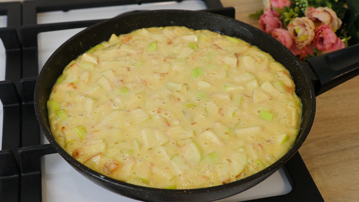 Сковорода диаметром 26 см смазывается сливочным маслом и в нее выливается готовая масса с яблоками. Важно равномерно распределить тесто по дну сковороды. Теперь, используя минимальный огонь, крышка должна быть надежно закрыта, что поможет сохранить влагу внутри. Выпекание займет 30-40 минут. Если крышка не имеет отверстия, рекомендуется вытирать лишнюю влагу во время процесса.