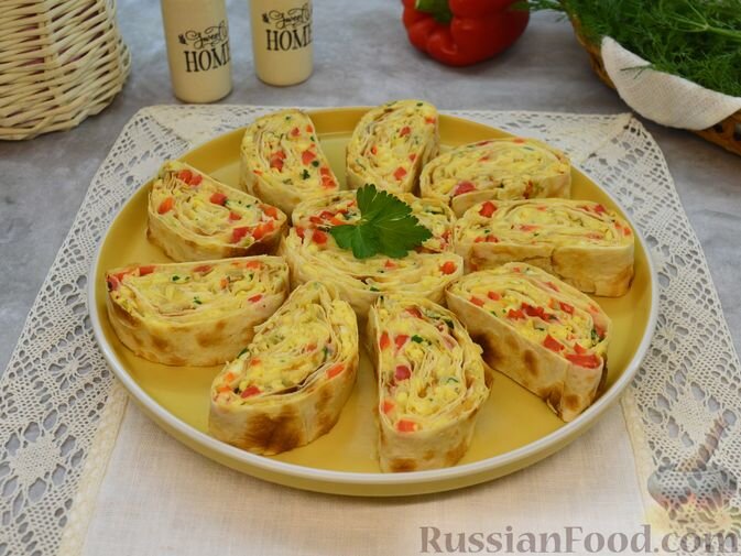 - Рулет из лаваша с омлетом и овощами: Тонкий лаваш с начинкой омлета скручивается в аппетитный рулет и запекается до золотистой корочки. Идеально для тех, кто ищет что-то новое и интересное для завтрака.