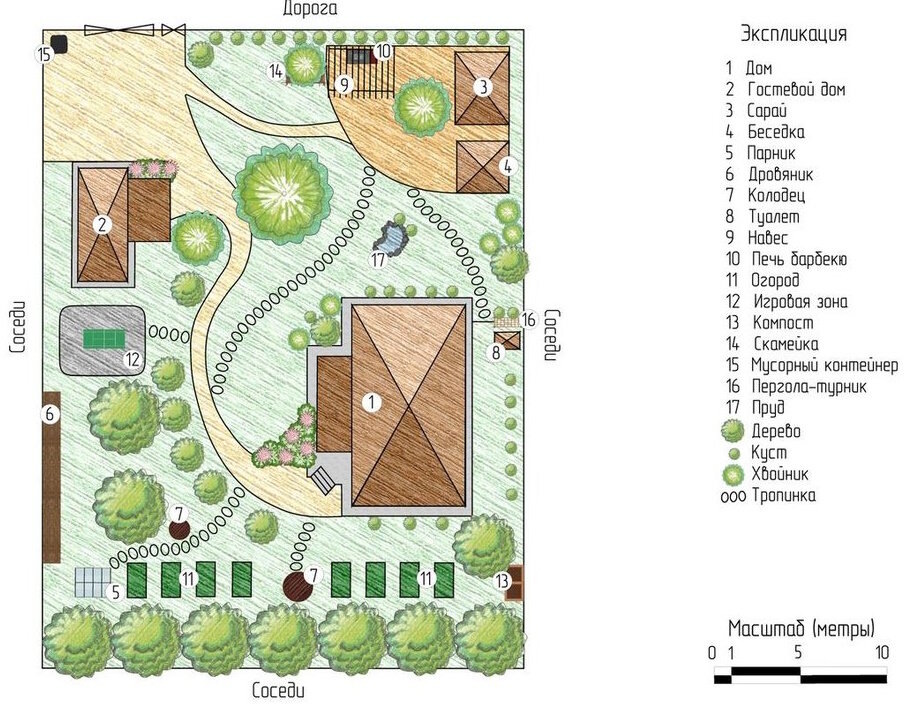 Обязательно отметьте такие важные пункты, как дом, хозпостройки и уже растущие деревья. Не забудьте указать и стороны света, так как это значительно упростит дальнейшее планирование.