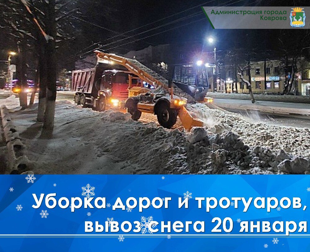 Сегодня ночью снег вывозили с пр. Ленина от пл. Победы до пл. 200-летия г. Коврова. Работали грейдер, погрузчик, трактор, 5 КАМАЗов, погрузчик лаповый.