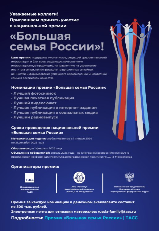 Журналисты, блогеры, редакции, эта новость для вас! Стартовала национальная премия «Большая семья России». Она организована Институтом демографической политики имени Д.И. Менделеева и ИА ТАСС при поддержке полномочного представителя Президента РФ в ЦФО.