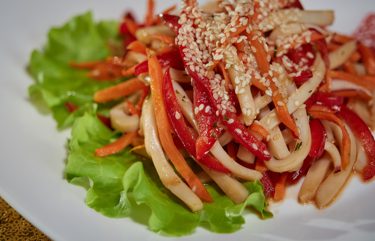 Для заправки смешивайте соевый соус, сахар, прессованный чеснок и уксус до однородной массы. В большой миске соедините кальмары, обжаренную морковь и перец, полейте соусом и перемешайте. Салат подается с посыпкой из кунжута.