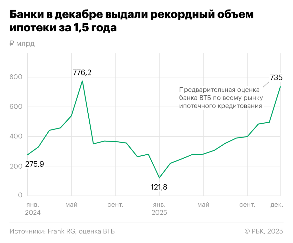 Активизация на рынке стала очевидной: банки зарегистрировали рост ипотечных сделок на 48% по сравнению с ноября, а в годовом выражении – в 2,6 раза. Например, объем выданных кредитов в декабре составил около 735 миллиардов рублей, что подтверждает стремительный рост интереса к недвижимости, отмечает РБК.