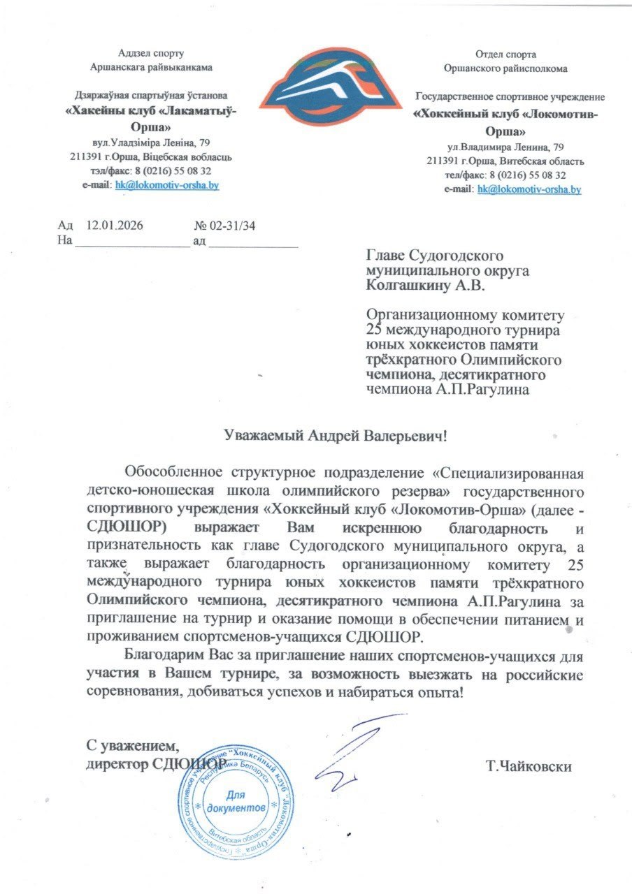 На днях на имя главы Судогодского округа Андрея Колгашкина и оргкомитета поступило письмо от наших друзей из Республики Беларусь, от ГСУ» Хоккейный клуб «Локомотив-Орша»: