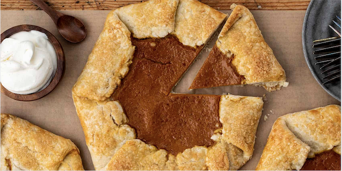 На рабочей поверхности разложите пергамент и слегка присыпьте мукой. Разделите тесто на четыре части и раскатайте до диаметра около 25 см. В центр каждого круга положите тыквенную начинку, оставляя края чистыми. Аккуратно заверните тесто по кругу, создавая складки.