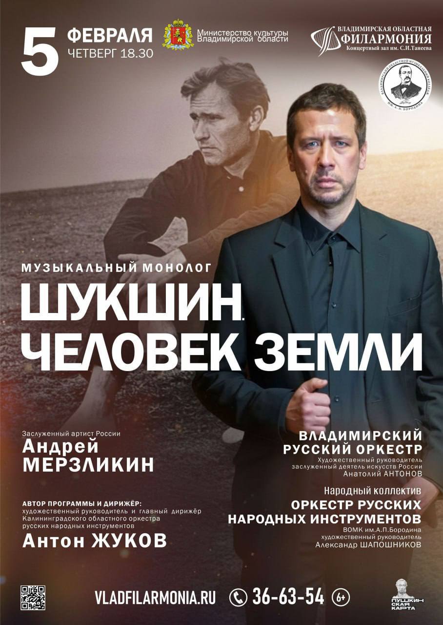 Заслуженный артист России Андрей Мерзликин приглашает владимирцев на уникальную программу. Музыкальный моноспектакль «Василий Шукшин. Человек земли» – новый совместный проект Владимирского областного музыкального колледжа и Владимирской областной филармонии.