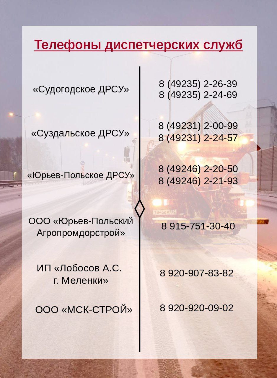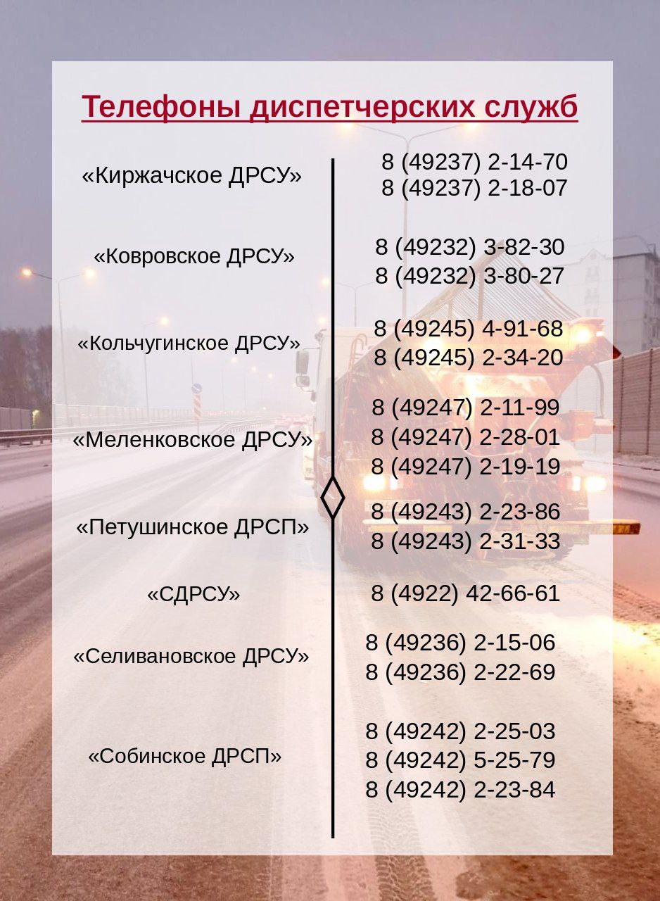 Минтранс Владимирской области поделился телефонами дежурно-диспетчерских служб, куда можно обратиться за помощью (см. карточки)