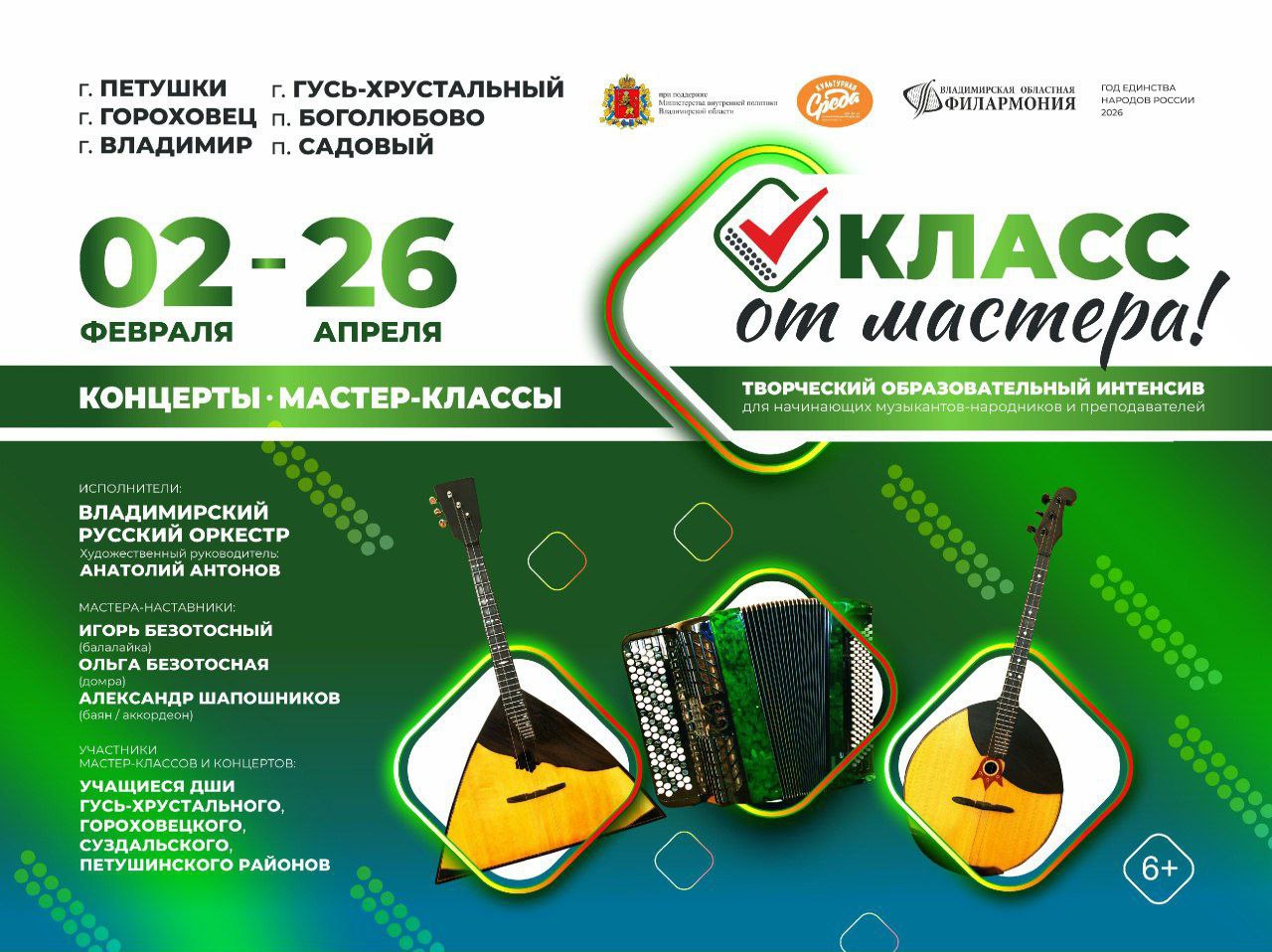 Первой эстафету мастер-классов в начале февраля принимает Детская школа искусств г.Гороховца, затем занятия пройдут в поселках Боголюбово и Садовый, городах Гусь-Хрустальный и Петушки. А кульминацией станет гала-концерт 26 апреля в областной филармонии, где юные таланты выступят вместе с оркестром.